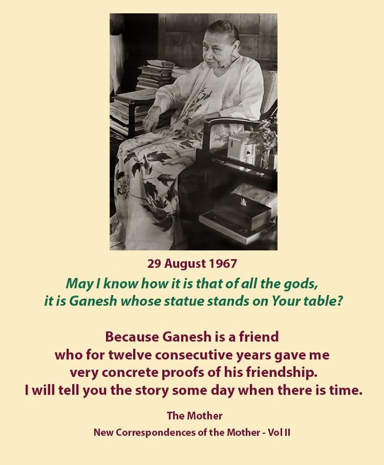 Le symbole de Mère est l’oeuvre de Samuel. Les photos de Ganesh la nuit sont de Luc.