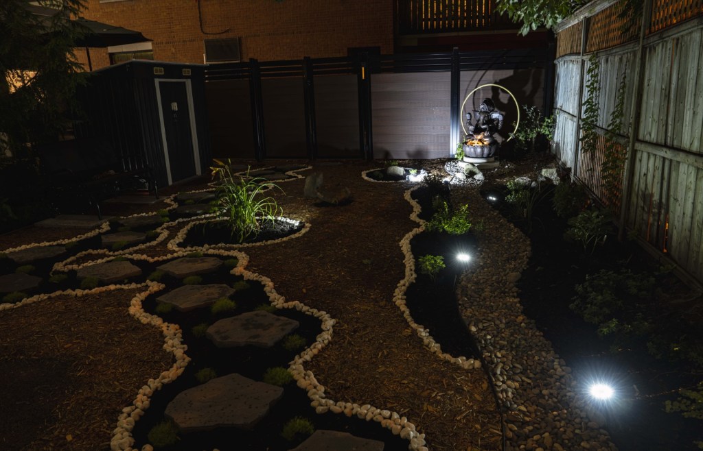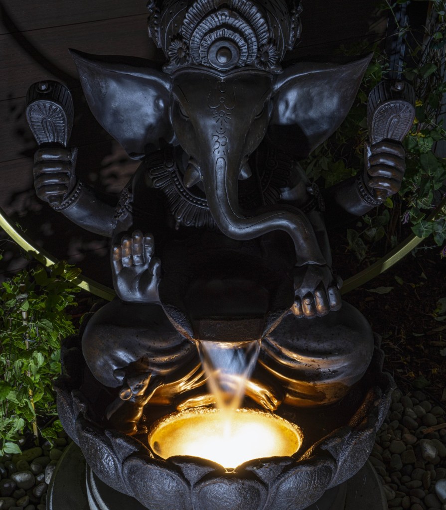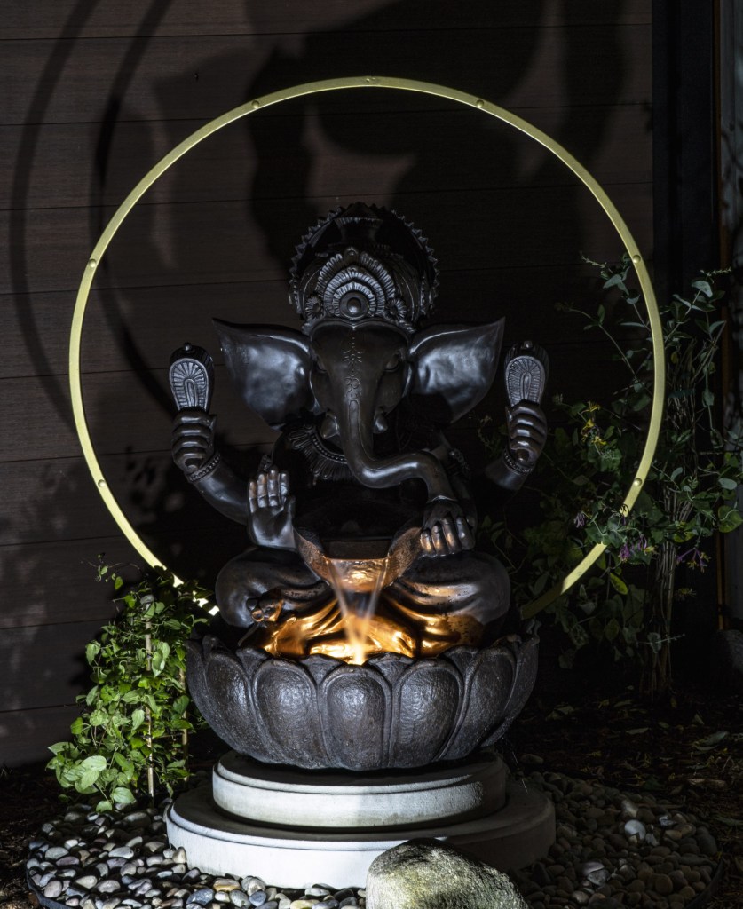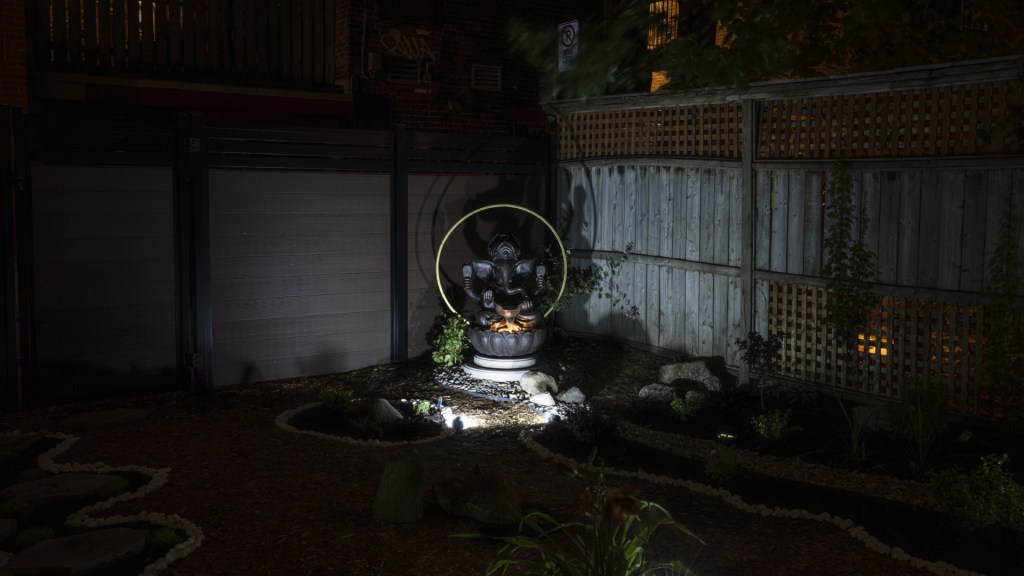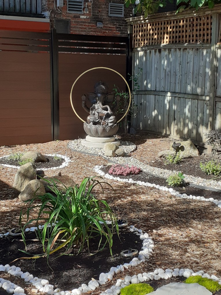 Pendant l’hiver 2023-2024, Laurence a conçu des esquisses de ce qu’elle souhaitait réaliser et les a partagées avec Samuel, Luc et moi. Des travaux ont eu lieu à partir du mois de mai afin d’essayer de traduire sur le terrain la vision de Laurence. Remplacement de la clôture, terrassement et préparation du sol, pose d’une membrane géotextile, choix des plantes, des cailloux et des pas japonais et finalement, trouver la fontaine qui convenait à l’ensemble. Ce magnifique Ganesh s’est tout naturellement imposé à nous et a fait l’unanimité. Nous avons tous, chacun à notre façon, participé à l’édification de ce jardin d’inspiration japonaise, qui évoque également les liens de notre aspiration québécoise avec l’Inde et l’Ashram de Sri Aurobindo.
