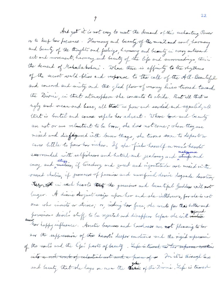 And yet it is not easy to meet the demand of this enchanting Power or to keep her presence. Harmony and beauty of the mind and soul, harmony and beauty of the thoughts and feelings, harmony and beauty in every outward act and movement, harmony and beauty of the life and surroundings, this is the demand of Mahalakshmi. Where there is affinity to the rhythms of the secret world-bliss and response to the call of the All Beautiful and concord and unity and the glad flow of many lives turned towards the Divine, in that atmosphere she consents to abide. But all that is ugly and mean and base, all that is poor and sordid and squalid, all that is brutal and coarse repels her advent. Where love and beauty are not or are reluctant to be born, she does not come; where they are mixed and disfigured with baser things, she turns soon to depart or cares little to pour her riches. If she finds herself in men’s hearts surrounded with selfishness and hatred and jealousy and malignance and envy and strife, if treachery and greed and ingratitude are mixed in the sacred chalice, if grossness of passion and unrefined desire degrade devotion, in such hearts the gracious and beautiful Goddess will not linger. A divine disgust seizes upon her and she withdraws, for she is not one who insists or strives; or, veiling her face, she waits for this bitter and poisonous devil’s stuff to be rejected and disappear before she will found anew her happy influence. Ascetic bareness and harshness are not pleasing to her nor the suppression of the heart’s deeper emotions and the rigid repression of the soul’s and the life’s parts of beauty. For it is through love and beauty that she lays on men the yoke of the Divine. Life is turned in her supreme creations into a rich work of celestial art and all existence into a poem of sacred delight; the world’s riches are brought together and concerted for a supreme order and even the simplest and commonest things are made wonderful by her intuition of unity and the breath of her spirit. Admitted to the heart she lifts wisdom to pinnacles of wonder and reveals to it the mystic secrets of the ecstasy that surpasses all knowledge, meets devotion with the passionate attraction of the Divine, teaches to strength and force the rhythm that keeps the might of their acts harmonious and in measure and casts on perfection the charm that makes it endure for ever.