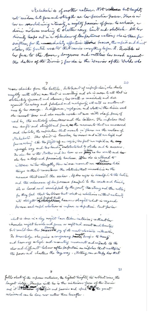 MAHAKALI is of another nature. Not wideness but height, not wisdom but force and strength are her peculiar power. There is in her an overwhelming intensity, a mighty passion of force to achieve, a divine violence rushing to shatter every limit and obstacle. All her divinity leaps out in a splendour of tempestuous action; she is there for swiftness, for the immediately effective process, the rapid and direct stroke, the frontal assault that carries everything before it. Terrible is her face to the Asura, dangerous and ruthless her mood against the haters of the Divine; for she is the Warrior of the Worlds who never shrinks from the battle. Intolerant of imperfection, she deals roughly with all in man that is unwilling and she is severe to all that is obstinately ignorant and obscure; her wrath is immediate and dire against treachery and falsehood and malignity, ill-will is smitten at once by her scourge. Indifference, negligence and sloth in the divine work she cannot bear and she smites awake at once with sharp pain, if need be, the untimely slumberer and the loiterer. The impulses that are swift and straight and frank, the movements that are unreserved and absolute, the aspiration that mounts in flame are the motion of Mahakali. Her spirit is tameless, her vision and will are high and far-reaching like the flight of an eagle, her feet are rapid on the upward way and her hands are outstretched to strike and to succour. For she too is the Mother and her love is as intense as her wrath and she has a deep and passionate kindness. When she is allowed to intervene in her strength, then in one moment are broken like things without consistence the obstacles that immobilise or the enemies that assail the seeker. If her anger is dreadful to the hostile and the vehemence of her pressure painful to the weak and timid, she is loved and worshipped by the great, the strong and the noble; for they feel that her blows beat what is rebellious in their material into strength and perfect truth, hammer straight what is wry and perverse and expel what is impure or defective. But for her what is done in a day might have taken centuries; without her Ananda might be wide and grave or soft and sweet and beautiful but would lose the flaming joy of its most absolute intensities. To knowledge she gives a conquering might, brings to beauty and harmony a high and mounting movement and imparts to the slow and difficult labour after perfection an impetus that multiplies the power and shortens the long way. Nothing can satisfy her that falls short of the supreme ecstasies, the highest heights, the noblest aims, the largest vistas. Therefore with her is the victorious force of the Divine and it is by grace of her fire and passion and speed if the great achievement can be done now rather than hereafter.
