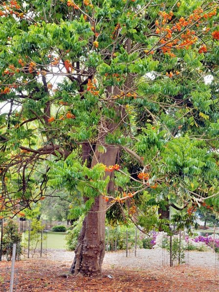 Small golden yellow to orange or reddish orange papilionaceous flower with long exserted stamens – borne on short lateral racemes on old wood. A medium-sized evergreen tree with dark green foliage. Significance of colours Yellow, golden yellow, orange.