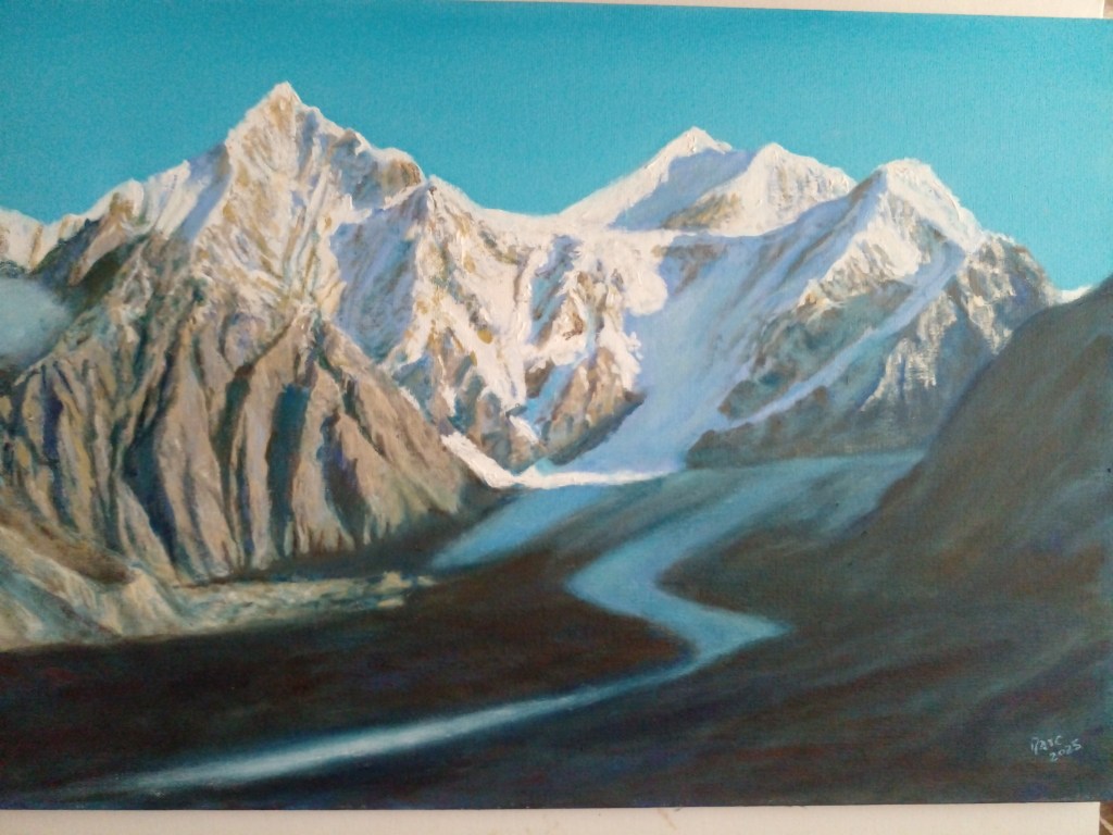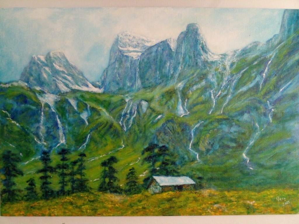 Oil on canvas board, average size 60x 40 cm. No particular technic, just a progression in several superimposed layers, more from feeling than “technical”.