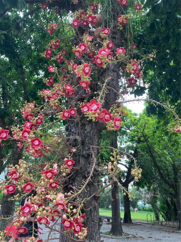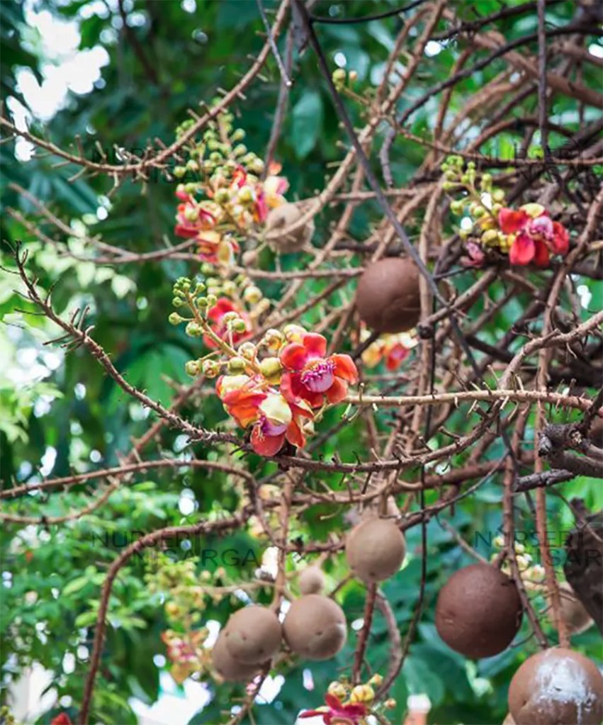 Prosperity — Large very fragrant light to deep red flowers with six wide fleshy satiny petals and a prominent central hood ending in numerous yellow-tipped stamens —borne in long pendulous racemes directly from the trunk and main branches. A moderately large tree with unique cannonball shaped fruits.