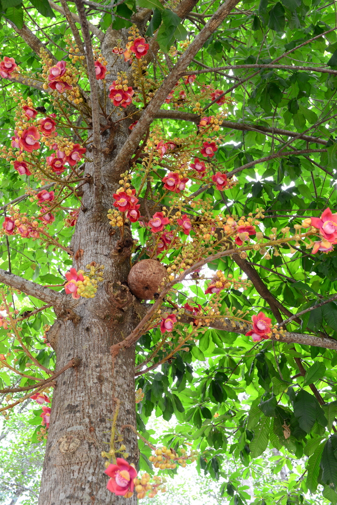 Couroupita guianensis, known by a variety of common names including cannonball tree, is a deciduous tree in the flowering plant family Lecythidaceae. It is native to lowland tropical rainforests of Central and South America, from Costa Rica, south to Brazil and northern Bolivia and it is cultivated in many other tropical areas throughout the world because of its fragrant flowers and large fruit, which are brownish grey. There are potential medicinal uses for many parts of Couroupita guianensis, and the tree has cultural and religious significance in South and Southeast Asia